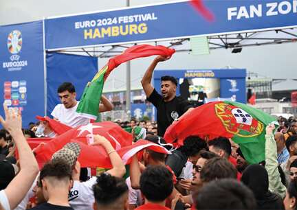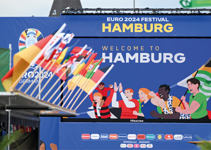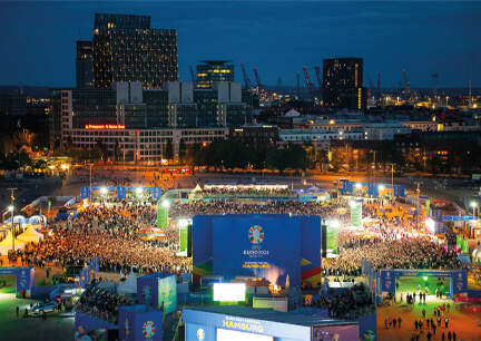 Eine Stadt im Zeichen der UEFA EURO 2024: Vom 14. Juni bis 14. Juli 2024 begeisterte das stimmungsvolle Fußballfest auf der Fan Zone mit Public Viewing über 600.000 Menschen in Hamburg. Das großzügige Eventgelände auf dem Heiligengeistfeld umfasste dabei neben dem Public-Viewing-Bereich für 40.000 Zuschauer auch die Fan Zone, ein Festivalgelände mit Football Arena, Activity Area, Gastronomie und Bühnenprogramm. „United by football“, das Motto der UEFA EURO 2024, galt dabei nicht nur für die Gäste aus ganz Europa, sondern für alle Beteiligten, die zum Gelingen dieses Events beigetragen haben – wir freuen uns, dass wir dazugehören durften.